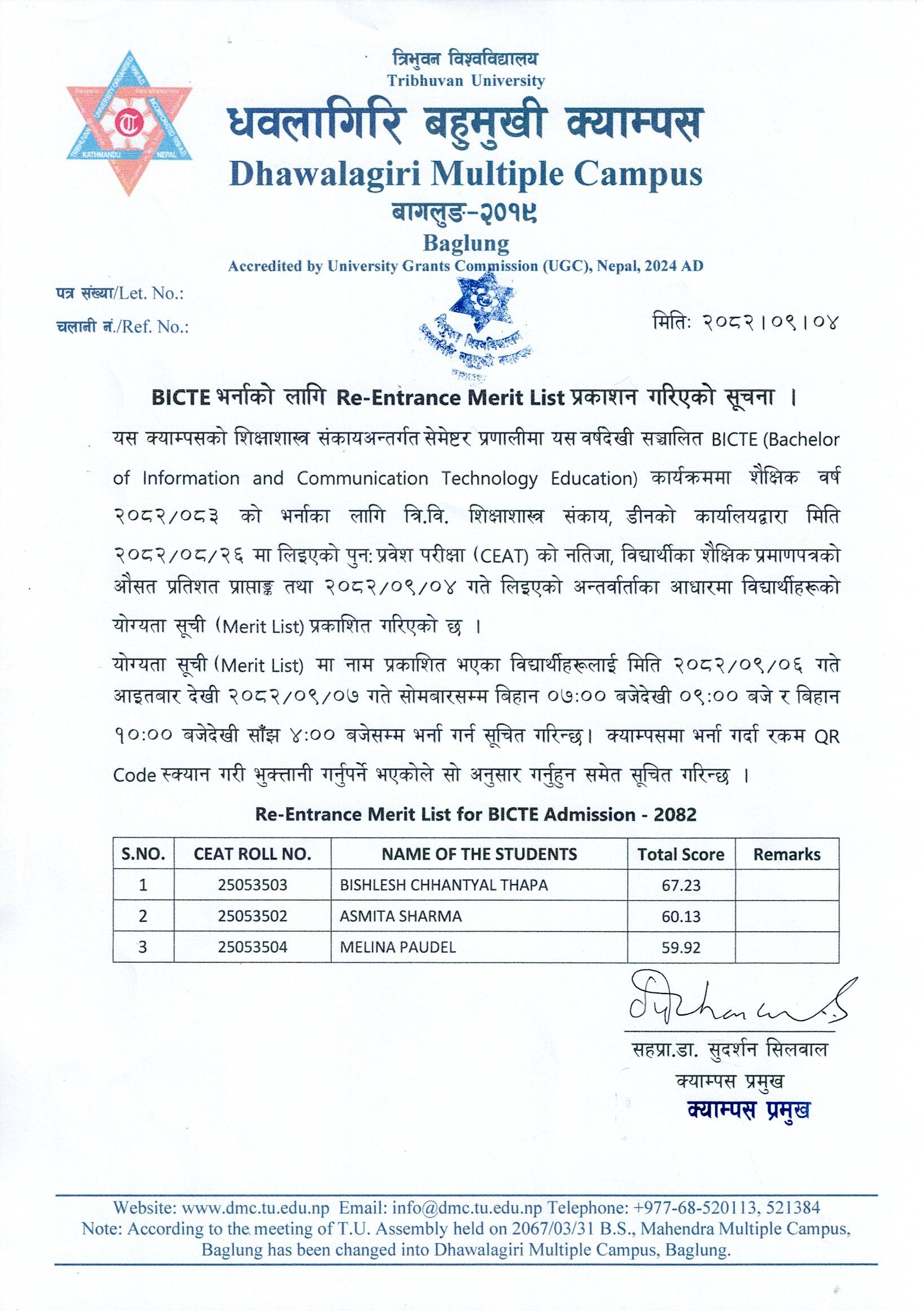 BICTE भर्नाको लागि Re-Entrance Merit List प्रकाशन गरिएको सूचना ।