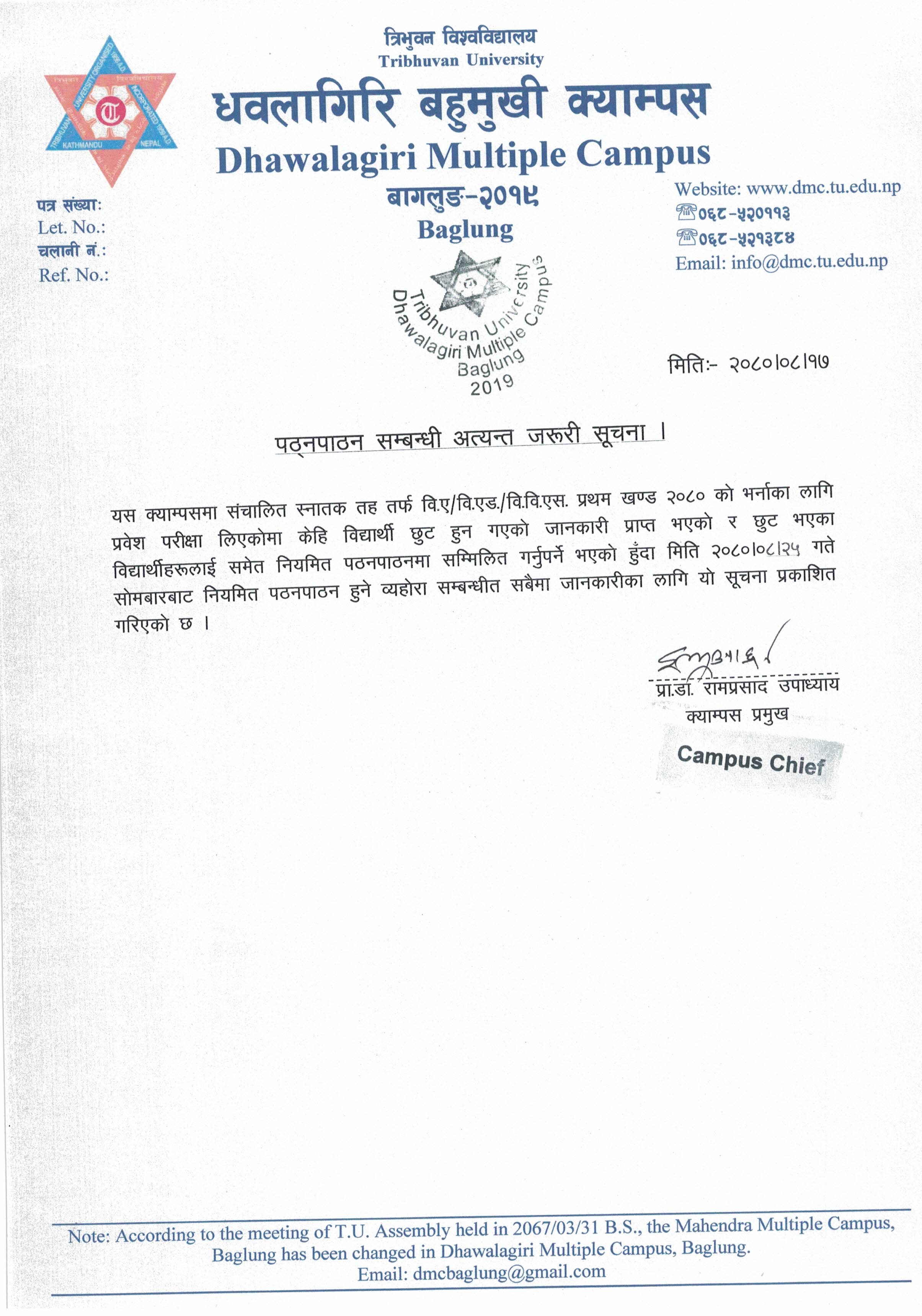 स्नातक प्रथम वर्षकाे कक्षा सञ्चालन सम्बन्धी सूचना ।