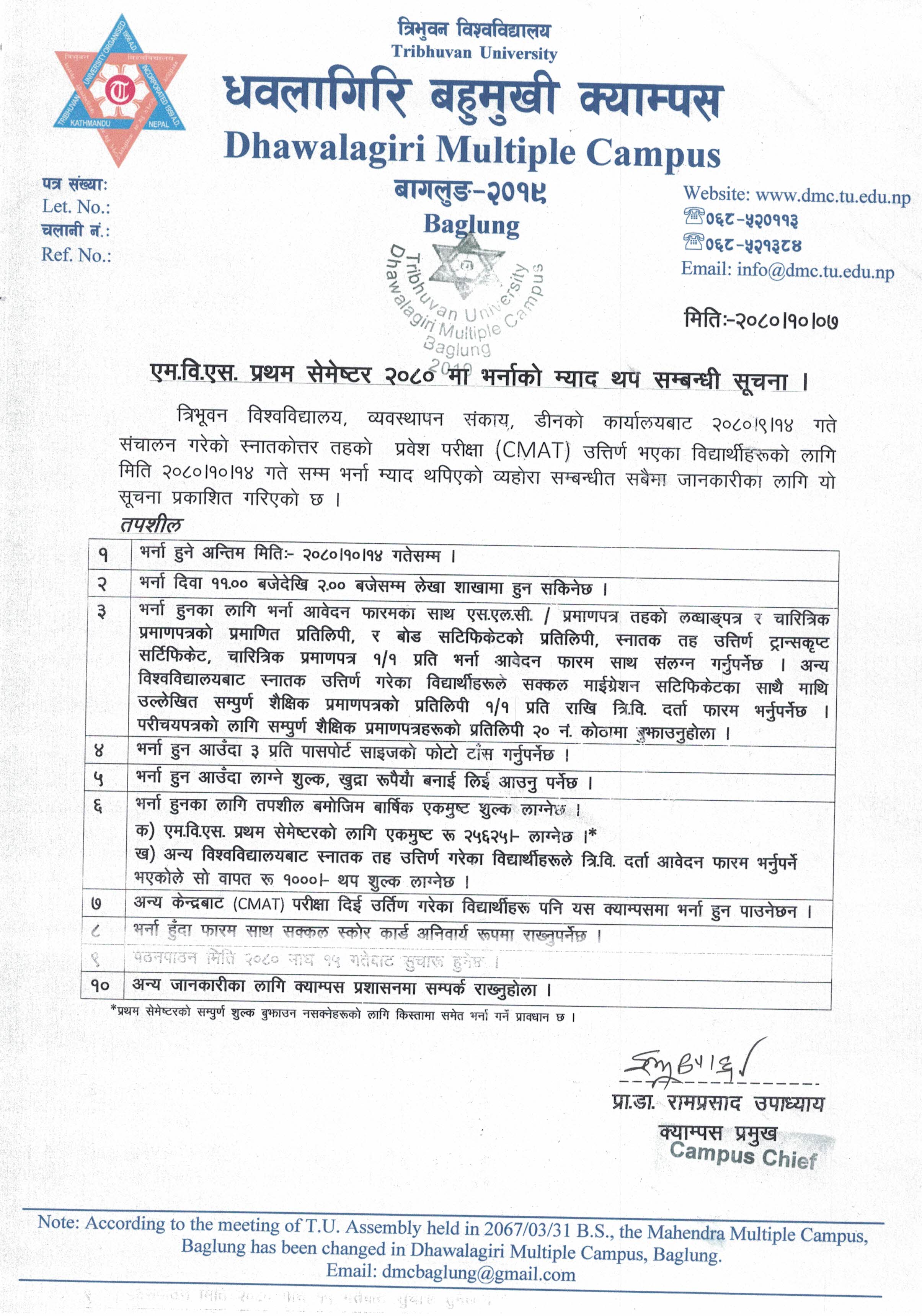 MBS प्रथम सेमेस्टरको भर्ना म्याद थपिएको सूचना ।