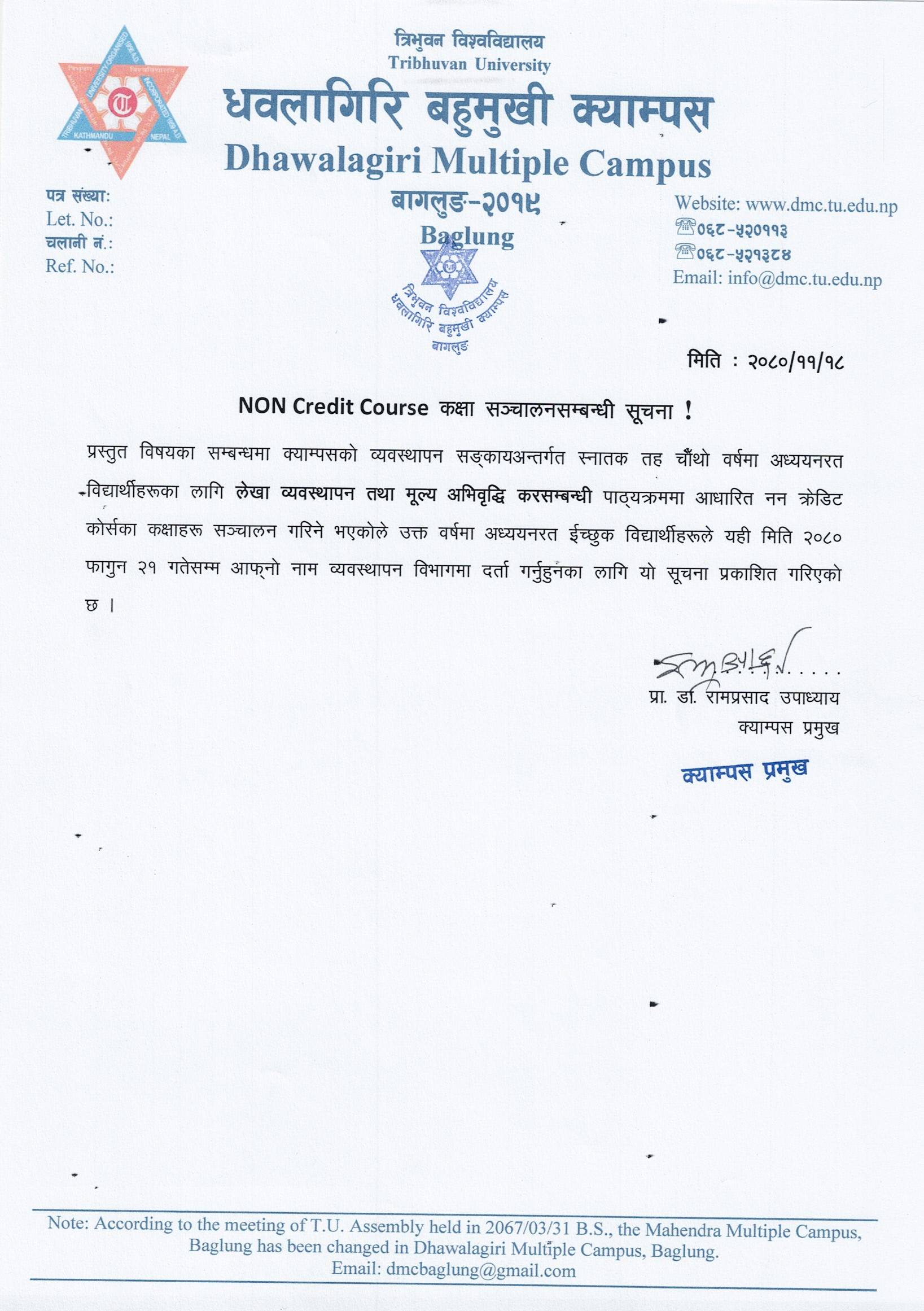 Non Credit Course कक्षा सञ्चालन सम्बन्धी सूचना ।