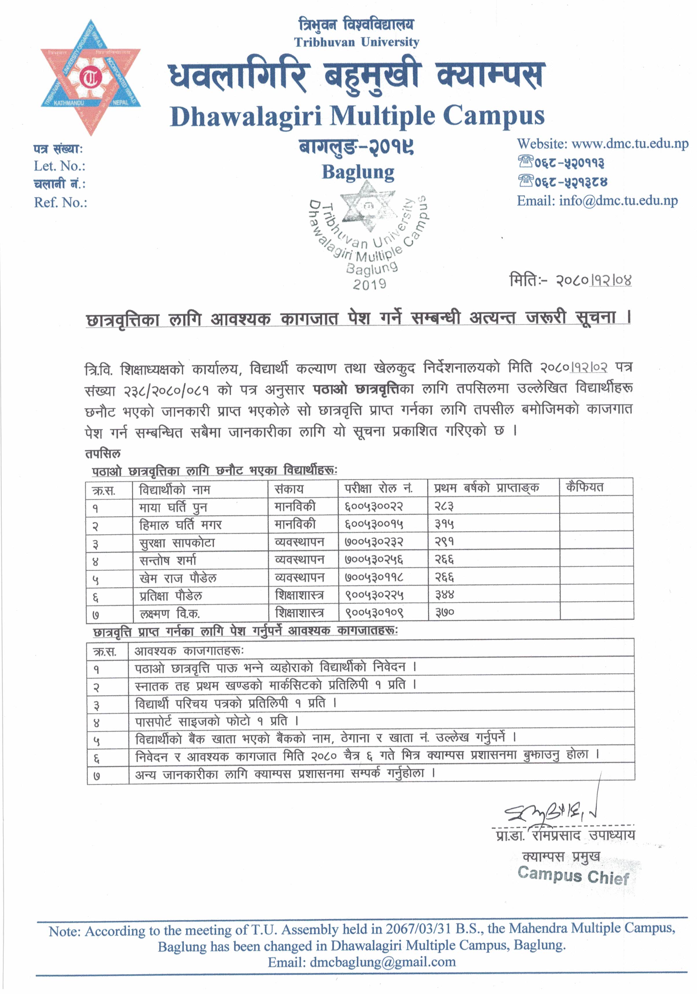 पठावाे छात्रवृति सम्बन्धी सूचना ।