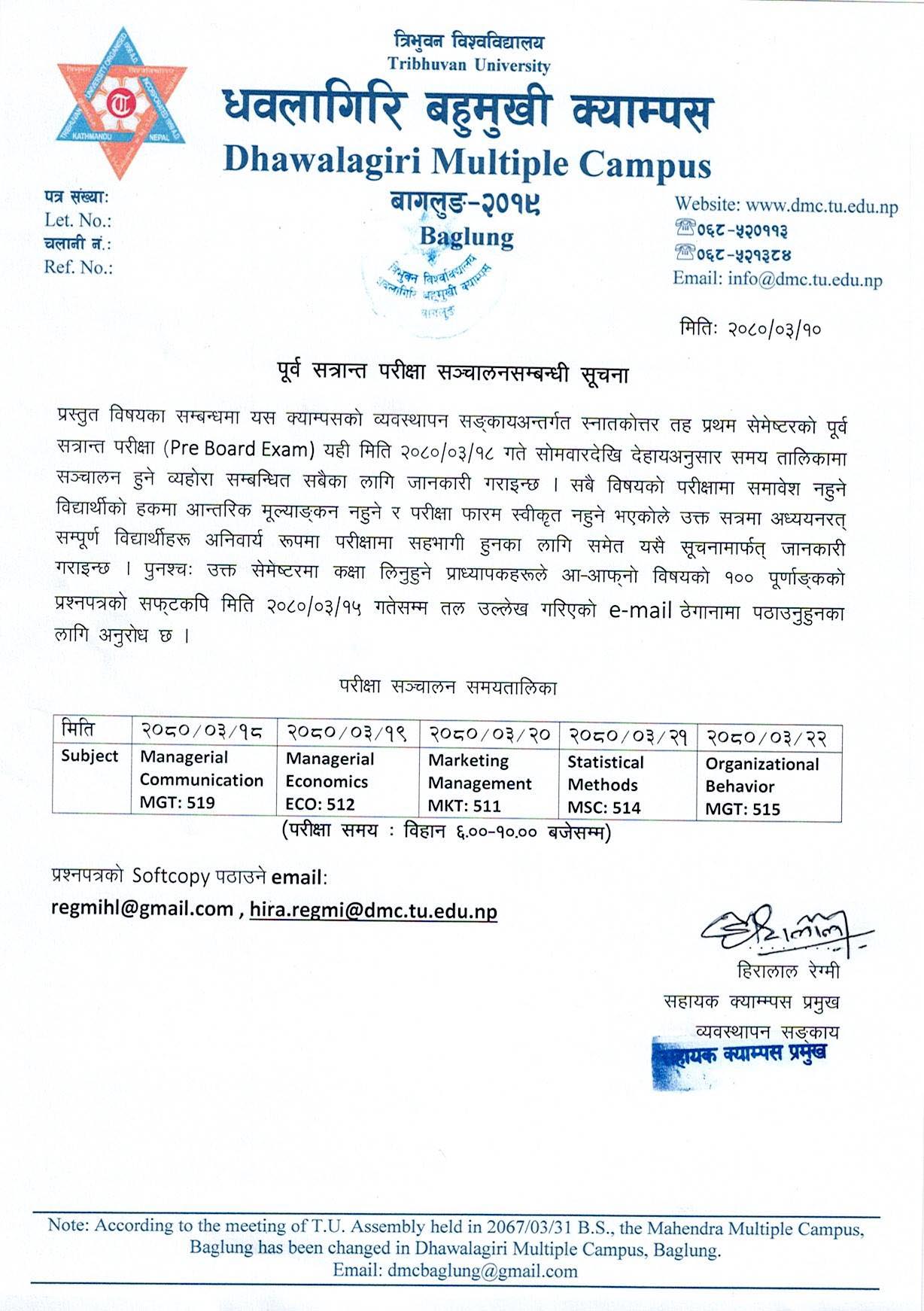 MBS 1st Semester पूर्व सत्रान्त परीक्षा (Pre-Board Exam) सञ्चालन सम्बन्धी सूचना ।