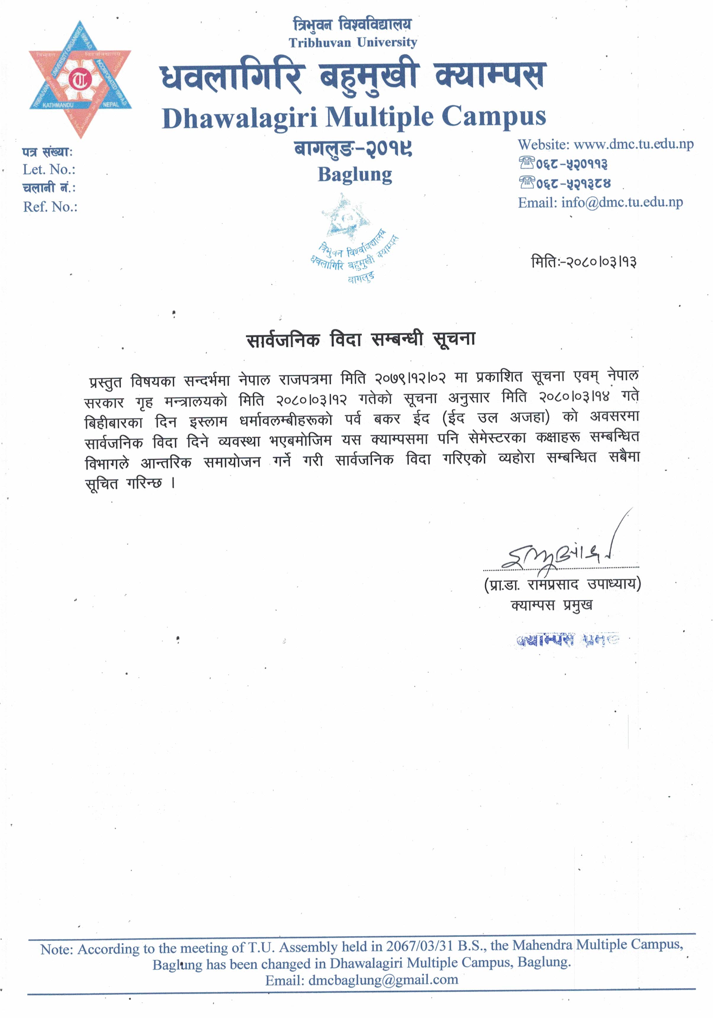 नेपाल सरकारले राजपत्रमा मिति २०७९।१२।०२ गते प्रकाशित सूचना एवम् नेपाल सरकार गृह मन्त्रालयकाे मिति २०८०।०३।१२ गतेकाे सूचना अनुसार मिति २०८०।०३।१४ गते बिहिवारका दिन इस्लाम धर्मावलम्वीहरुकाे पर्व इदकाे अवसरमा सार्वजनिक विदा दिने व्यवस्था भएबमाेजिम यस क्याम्पमा पनि सेमेस्टरका कक्षाहरु सम्बन्धित विभागले आन्तरिक समाजाेजन गर्ने गरी सार्वजनिक विदा गरिएकाे व्यहाेरा सम्बद्ध सबैमा सूचित गरिन्छ ।