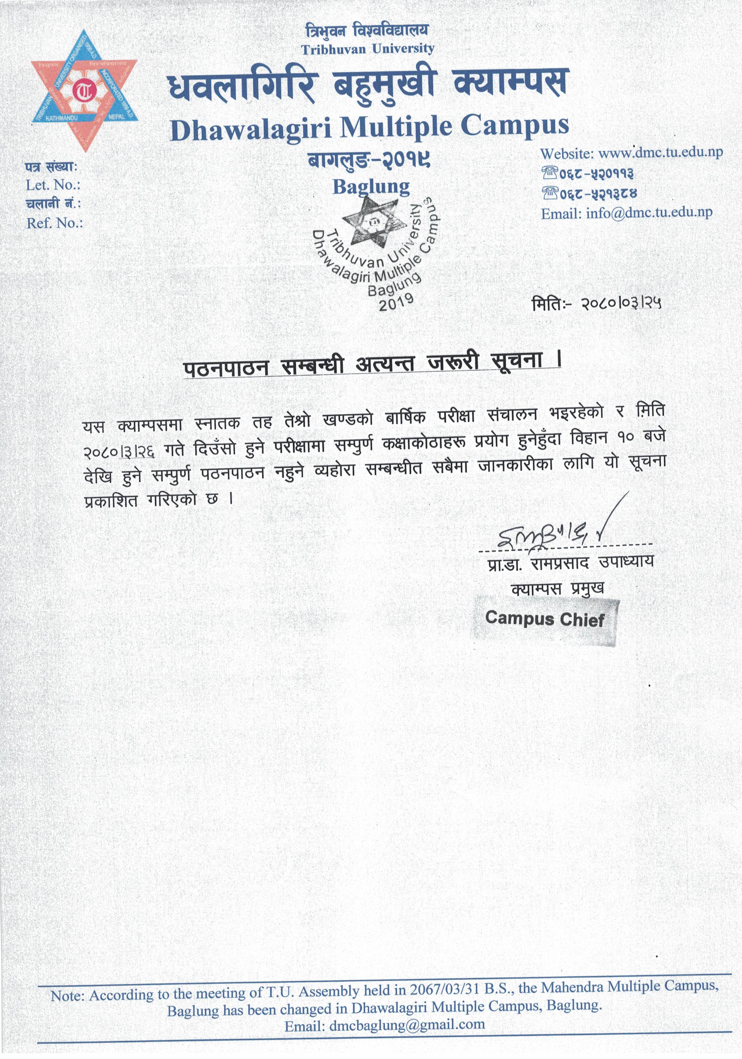 स्नातक तेस्राे वर्षकाे अन्तिम परीक्षा संचालन गर्नु पर्ने भएकाले मिति २०८० असार २६ गते दिवा सत्रका कक्षाहरु बन्द रहने हुदाँ सम्बन्धित सबैमा सूचित गरिन्छ ।