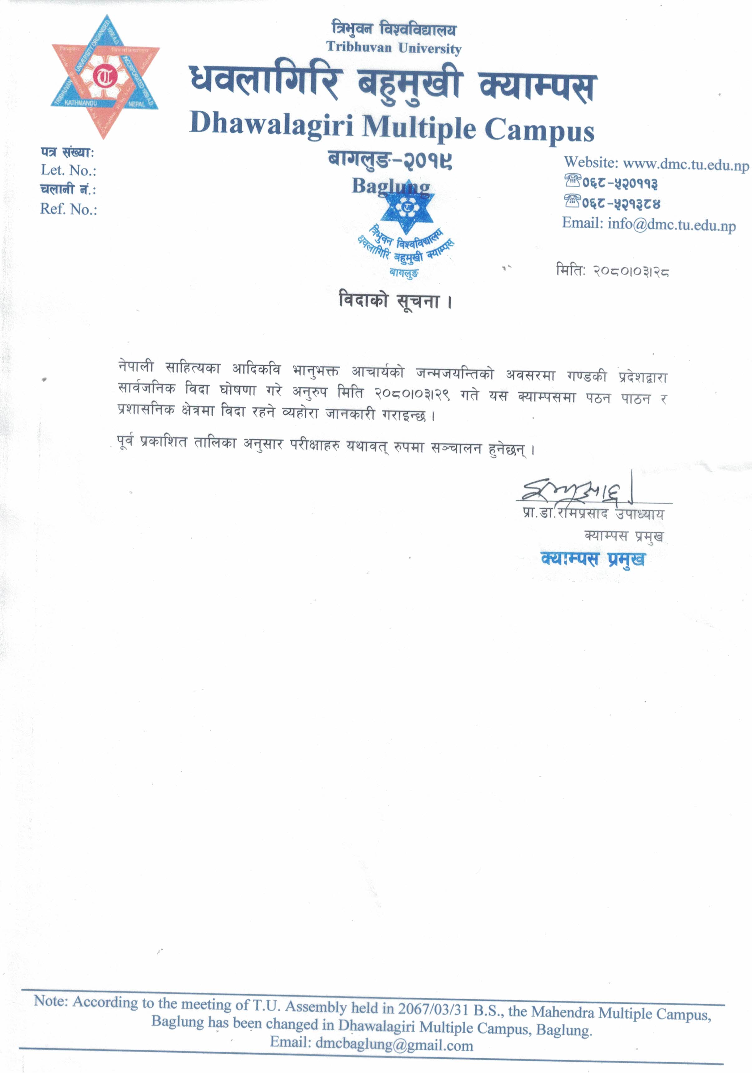 नेपाली साहित्यका आदिकवि भानुभक्त आचार्यको जन्मजयन्तिको अवसरमा गण्डकी प्रदेशद्वारा सार्वजनिक विदा घोषणा गरे अनुरुप मिति २०८०।०३।२९ गते यस क्याम्पसमा पठन पाठन र प्रशासनिक क्षेत्रमा विदा रहने व्यहोरा जानकारी गराइन्छ ।