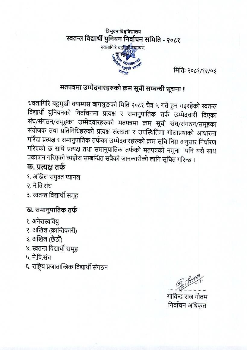 मतपत्रमा उम्मेदवारहरुको क्रम सूची सम्बन्धी सूचना !