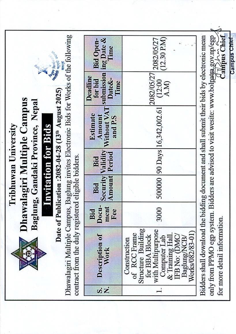Dhawalagiri Multiple Campus, Baglung invites Electronic Bids for Works of the following contract from the duly registered eligible bidders.