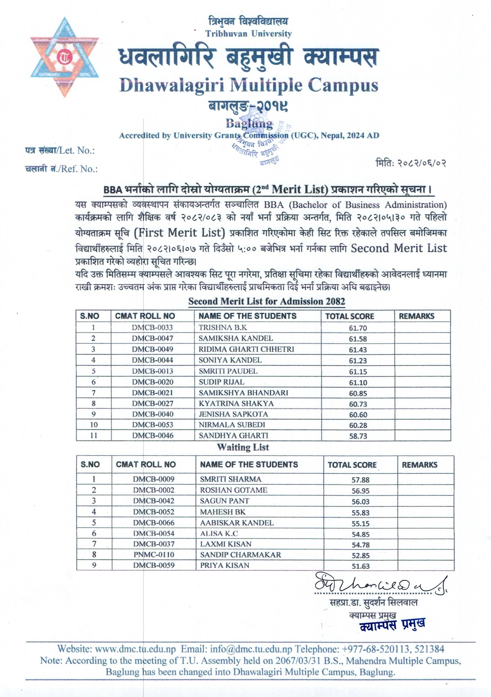 BBA भर्नाको लागि दोस्रो योग्यताक्रम (20d Merit List) प्रकाशन गरिएको सूचना ।