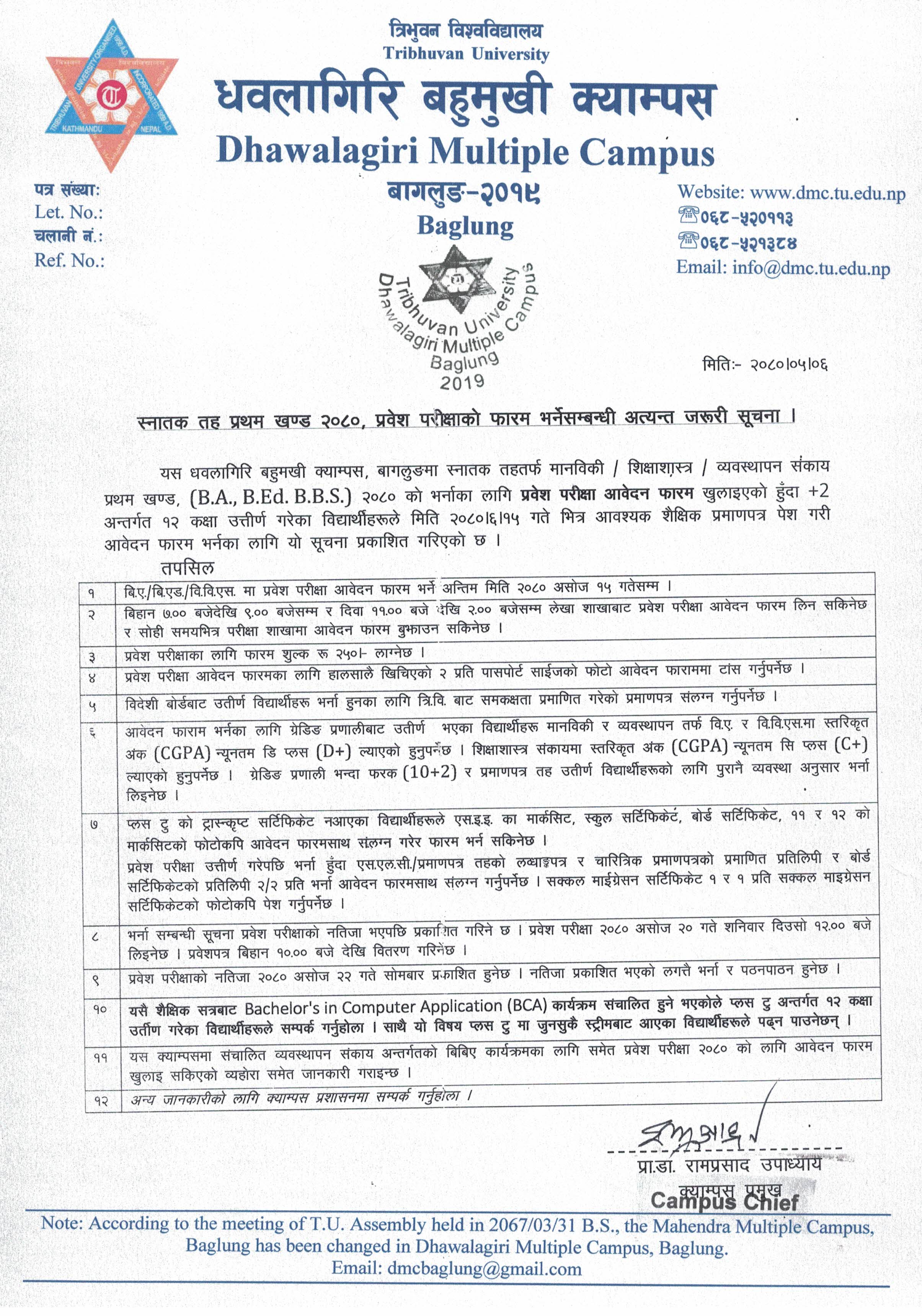 धवलागिरि बहुुमुखी क्याम्पस बागलुङमा शैक्षिक सत्र २०८० का लागि BA, B.Ed र BBS मा अध्ययन गर्न चाहेका कक्षा १२ उत्तीर्ण गरेका सम्पूर्ण विद्याथीहरुलाइ प्रवेश परीक्षाकाे फारम भर्न सूचित गरिन्छ ।